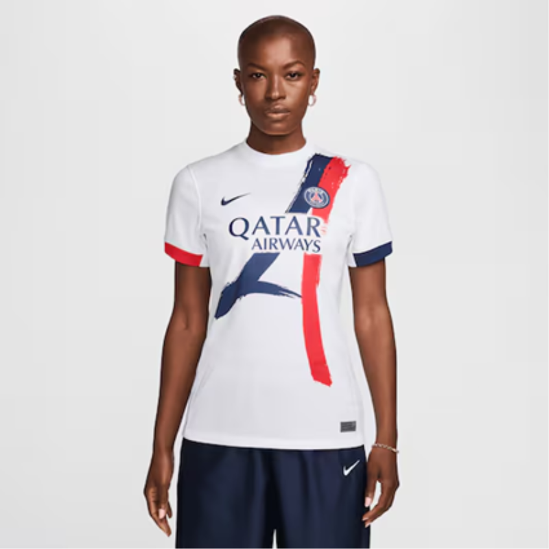- Details: The 25/26 Away kit pays homage to an iconic Club shirt worn by Parisians during the 1990-91 and 1991-92 seasons, while also embodying the innovative spirit of the club's new generation. Featuring two red and blue stripes on a white background, the shirt takes inspiration from the iconic silhouette of the Eiffel Tower. The kit will be worn by all Paris Saint-Germain teams, including both the men's and women's professional teams, as well as its academy teams.